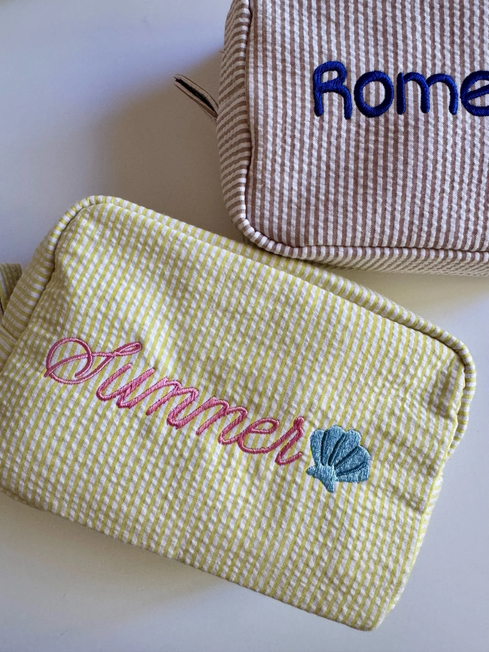 Seersucker outer with a plastic lining, perfect for makeup and skincare.